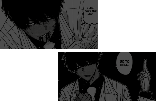 overlook. outwardly, Grim appears to be like the average salaryman. his eyes are often surrounded by dark circles & his voice is rather unamused, the classic aesthetic of someone who’s tired of their dead-end 9 to 5. Grim may seem like the kind of person to push others away. when his mind is preoccupied with more entertaining thoughts, plans or work he’ll unapologetically ignore the presence of others & to some extent this is his way of showing blatant disrespect. there’s joy he gets from watching others blood boil, especially when he is the cause. he’s commonly recognized as a pest & ‘Fathers Favourite’ among those he works with, something he occasionally tots with pride knowing he has something over their heads. there’s also pride to be had with his ability to get his work done at a much faster rate without any errors or need for peer review, giving him plenty of free time to fool around in the office he works in.